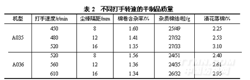 綜合考慮用棉與半制品質量,A035棉箱采用打手轉速為480/min,塵棒隔距12mm,A036豪豬打手轉速560r/min,塵棒隔距12mm。其他打手轉速與塵棒隔距保持不變,凝棉器風扇轉速調整以棉流順利通過為準,速度太低時棉流無法正常通過,轉速太高則棉花在風道中翻滾,容易造成棉束,產生棉結,而且造成了能源的浪費。
