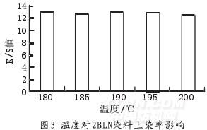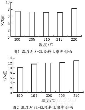從圖1、圖2、圖3中可以得出,最佳熱熔溫度分別是:S-GL 220℃,SE-RL 210℃,2BLN 195℃,由于染料結構的不同,其升華溫度也不同,隨溫度的升高,染料的上染率逐漸增加;溫度較低時,纖維沒有足夠大的空隙染料升華未能進入纖維內部固著,從而影響上染率;溫度太高,染料大量升華逸入大氣,固著纖維內的染料也會升華,從而降低染料的上染率。實際生產中使用中溫型或高溫型分散染料比較適合熱熔染色。