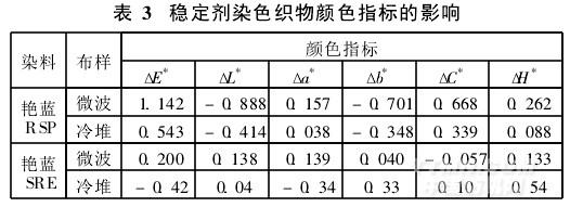 按照表2配制染液,按下述方法測定其顏色指標。以對燒堿比較敏感的活性艷藍為例,將只加燒堿進行冷軋堆染色的布樣作為標樣,用加入穩定劑后染色的布樣與之對比,測定布樣顏色指標的差值,結果見表3。