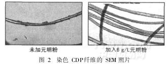 CDP纖維在高溫條件下易水解,會(huì)降低纖維的強(qiáng)力,同時(shí)也使得表面得色變淺。若在染色配方中加入6 g/L元明粉,則可防止纖維水解,如圖2所示。