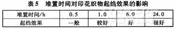 織物浸堿后堆置時(shí)間要適當(dāng)延長(zhǎng),目的是充分堿縮。堿縮越充分,起縐透明印花越明顯,起縐透明效果越好,結(jié)果見(jiàn)表5。