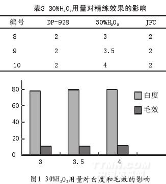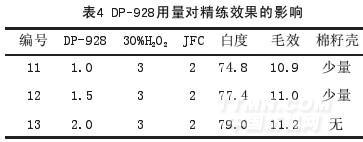 當(dāng)H2O2為3g/L,滲透劑2g/L時(shí),毛效好,且都差不多,表明DP-928的用量對(duì)毛效影響不大;而白度提高比較明顯,當(dāng)DP-928用量在2g/L以下時(shí)白度較低,布面效果不理想,有少量棉籽殼。所以確定DP-928用量為2g/L。