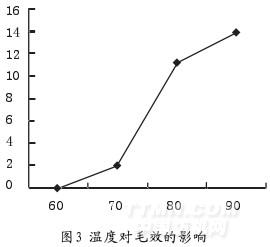 由圖2可知:溫度低于80℃時,織物白度隨著精練溫度的升高而迅速提高;超過80℃后,織物白度增加緩慢。說明精練工作液在80℃時已經處于較佳狀態。而且溫度低于80℃處理的白度都較低,布面有少量棉籽殼,處理不達標。