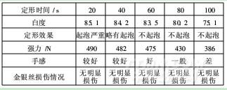 由表5可知,定形時間長,定形效果好,且對金銀絲基本無損傷。但定形時間超過60s,白度、手感和強力下降明顯,手感變硬。綜合考慮,定形時間確定60s。
