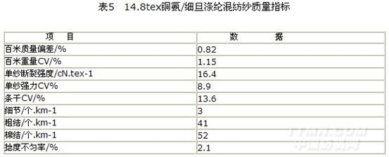 14.8tex銅氨/細旦滌綸混紡紗的質量水平見表5。