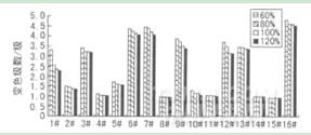 從圖4可知,輻照量對織物耐光/氯化水復合色牢度測試的影響很大,是影響復合色牢度的主要因素。