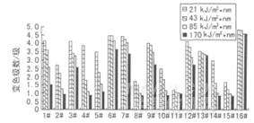 由圖4知,隨著輻照量增加,織物變色程度均增加。除變色級數處于低水平的11#石綠色織物和變色級數處于高水平的16#黑色織物外,其它織物變色級數降幅均較大。如1#枚紅色織物的變色程度由21kJ/(m2·nm)輻照后的4.153級降到170kJ/(m2·nm)輻照后的1.504級,下降了2.649級。