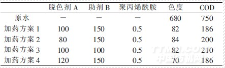 原工藝采取先將廢水pH 調節到6~9 后再投加硫酸亞鐵和聚丙烯酰胺進行混凝的方式,其中硫酸亞鐵投加質量濃度約為2 000 mg/L,聚丙烯酰胺約為3 mg/L。由于硫酸亞鐵本身的還原性和顏色,在用藥量大的情況下,容易發生返色現象,且其在堿性條件下與PAM 的復配使用效果不佳,從而出現產水色度偏高、COD 去除率低等問題,排污指標超過《紡織染整工業水污染物排放標準》規定的Ⅱ級排放標準。