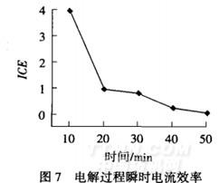 從圖7可知,電解過程中的瞬時電流效率總體趨勢是隨電解時間延長而下降.電解10min時,三維電極的ICE高達3.9,這一結果與YaXiong等人試驗結果相似,是由包括陽極直接氧化、陰極H202間接氧化與活性炭粒子電極吸附一電解共同作用的結果.[15]此后,ICE雖然下降較快,在20min、30min時仍然分別高達0.94和0.79,顯示出復極性三維三相體系在電催化氧化過程的30min內保持了相當高的電能利用效率.因此,對高濃度COD有機污染物,可先采用短時的電催化降解、后續聯合生化處理,既節約能耗又取得了很好的降解效果.