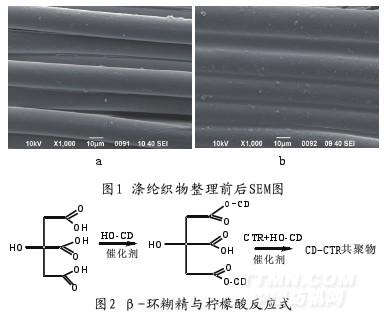 盡管檸檬酸與滌綸之間不會發生反應,但由檸檬酸中含有多個羧基,β-環糊精中含有大量羥基,它們都是多官能團化合物,進一步縮聚后就可形成網狀結構的縮聚物,因此將其整理到織物上后,經焙烘會生成網狀結構的縮聚物,纏繞在纖維內部或沉積在其無定形區內,而且環糊精的空間結構較大,可以嵌在纖維的無定形區中[3]。圖1(a)和(b)是整理前后的滌綸織物電鏡圖片。圖1(a)可以觀察到未經處理的纖維光滑的表面和纖維之間的空隙。圖1(b)顯示了改性滌綸織物表面的檸檬酸-β-環糊精涂層。聚合物的固著穩定性與反應條件有關,反應越充分,形成的共聚物分子量越大,其穩定性越好[4]。反應式見圖2。