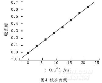 由紫外分光光度計測得標準溶液的最大吸收波長為729nm。用線性回歸法所得到硫酸銅標準曲線如圖4所示。該標準曲線的方程為y=0.00359+0.03x,R2=0.99946。其中y為溶液吸光度,x為Cu2+質量濃度。