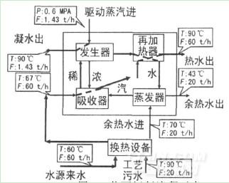 技術(shù)原理 溴化鋰濃溶液具有強(qiáng)吸水性。在吸收器內(nèi),利用溴化鋰濃溶液的強(qiáng)吸水性特點(diǎn),吸收來自蒸發(fā)器的水蒸汽,提高溶液的溫度,加熱需要提高溫度的熱媒,實(shí)現(xiàn)了所吸收廢熱的熱量轉(zhuǎn)移,同時溴化鋰溶液由濃變稀,不再具有吸水性。