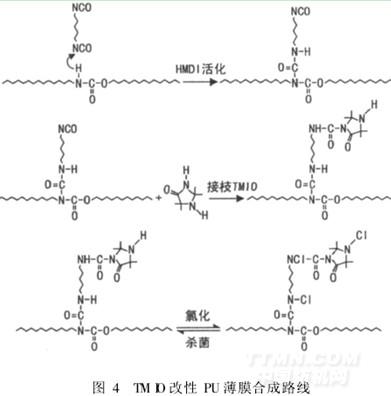 該薄膜通過在聚氨酯上接枝聚乙二醇(PEG)改性而得。一般采用二步法工藝(見圖4)。