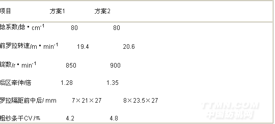 減小羅拉隔距,有利于對牽伸區內浮游纖維的控制,同時適當減小后區牽伸倍數,發揮主牽伸區的作用,有利于提高粗紗的條干CV 值。