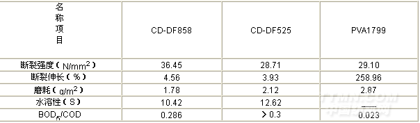 2.2 CD-DF858是經(jīng)過醚化、酯化預(yù)處理后,再進(jìn)行接枝共聚的多元復(fù)合變性淀粉為主,通過先進(jìn)工藝加入特殊高聚物制成。其粘度低,流動性好,對紗線的浸透性能好,不含PVA,適用于純棉、滌棉高支高密的經(jīng)紗上漿,可完全取代PVA,其BOD5/COD=0.286基本達(dá)到環(huán)保要求。
