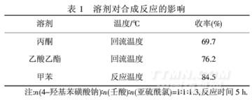 由表1可知,以甲苯為溶劑,目標產物的收率最高.原因是加熱時,壬酸溶于甲苯,4-羥基苯磺酸鈉在甲苯中有一定溶解性,而目標產物難溶,隨著反應過程的不斷進行,反應混合物中4-羥基苯磺酸鈉逐漸消失,目標產物漸漸析出,有利于反應向正方向進行.因此,選用甲苯為反應溶劑.