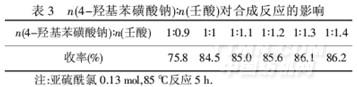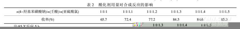 由表3可知,亞硫酰氯用量一定時,增加壬酸的用量,目標產物的收率均有增加,當n(4-羥基苯磺酸鈉)∶n(壬酸)=1∶1~1∶1.4時,收率增加不到2%,考慮節省原料等因素,確定n(4-羥基苯磺酸鈉)∶n(壬酸)=1∶1為宜.