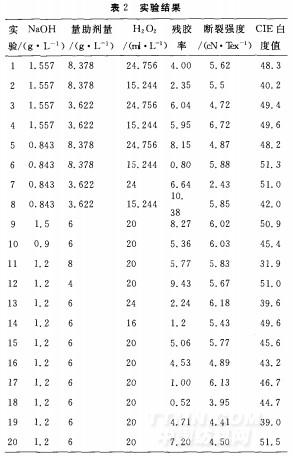 為研究精干麻殘膠率、白度和斷裂強度隨堿煮練工藝參數改變而變化的規律,本文采用了2次通用旋轉實驗設計.因為氫氧化鈉量、助劑量和雙氧水量對殘膠率和白度影響較大,因此選取以上3個參數作為實驗因子,采用三因子二次旋轉組合設計進行實驗安排,其因子編碼水平見表1.
