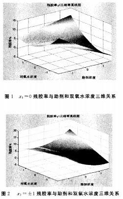 由殘膠率Y()與三因子的回歸方程可知:助劑濃度和雙氧水濃度對去除苧麻膠質較顯著,且助劑濃度對殘膠率的影響大于雙氧水濃度,二者之間也存在較顯著的交互作用;而堿液濃度同殘膠率為二次關系,對殘膠率作用不明顯.利用Matlab分別得到z一0、±1時殘膠率與助劑和雙氧水濃度三維關系,如圖1和圖2所示.比較圖1和圖2,在不同的堿液條件下,使用的助劑濃度越高,雙氧水的濃度越低,殘膠率越小,脫膠效果越好.可見,采用氫氧化鈉浸泡苧麻處理后,使用自配助劑對苧麻脫膠,可以達到減少雙氧水和燒堿用量,并得到較好脫膠效果的目的.