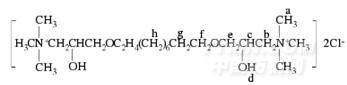 取出一定量中間體放進干燥的三口燒瓶中,加入三甲胺鹽酸鹽(按1∶2反應)、無水乙醇(50 mL),將反應溶液以33%三甲胺水溶液調節pH至9,40℃攪拌反應3 h.蒸出乙醇和水,得到DCPS2-10粗品,將粗品用石油醚洗滌3次,再用丙酮多次重結晶.最后在真空情況下干燥5 h,得到DCPS2-10較純品.陽離子Bola型表面活性劑結構式如下: