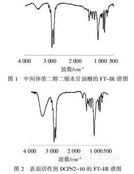 從圖3可以看出,3.14×10-6處為季銨鹽甲基上氫(a)的信號,3.43×10-6處出現羥基上氫(d)的信號,4.29×10-6處為與羥基相連碳原子上氫(c)的信號,1.21×10-6處出現分子中長碳鏈亞甲基上氫(h)的信號,1.48×10-6處出現醚鍵隔一位的亞甲基上氫(g)的信號,在(3.18~3.37)×10-6集中出現了醚鍵兩邊和與氮原子相連的亞甲基上氫原子(b、e、f)的信號.
