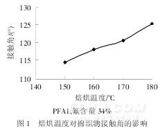 由圖1可看出,焙烘溫度越高,織物的拒水性能越好.因為在焙烘過程中,溫度過低不能保證整理劑與織物發生化學鍵合,也不利于整理劑分子間交聯成膜.且隨著溫度升高,焙烘時整理劑的分子熱運動加快,含氟基團就更容易遷移到表面形成致密的疏水層,達到更好的拒水性能.通常,棉織物整理時焙烘溫度為150~180℃.但溫度太高會破壞棉纖維的結構,影響織物的強力和白度等,因此,選用焙烘溫度為170℃,并且用于指導PFA2和PFA3整理劑乳液對棉織物的整理.
