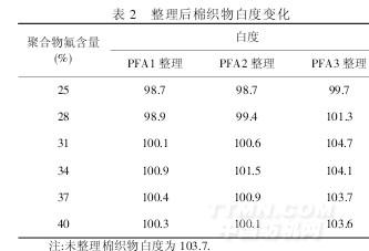 由表2可知,整理后棉織物白度都略有降低.其中經PFA3整理前后織物白度基本不變,且各種氟含量的PFA3整理棉織物的白度都較相應的PFA2和PFA1整理棉織物高.