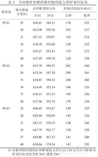 由表3可以看出,所有經過整理的棉織物拉伸斷裂強力普遍提高,且隨著聚合物氟含量的增加,整理織物的強力也隨之提高;整理后棉織物急彈性回復角降低幅度較大,其中PFA1和PFA3整理后下降較多,這可能與PFA1和PFA3中含氟單體上的甲基有關.含氟烷基的甲基丙烯酸酯在形成的共聚物結構中,側基上甲基由于較大的立體位阻而增加了聚合物主鏈的內旋轉難度,從而在纖維表面成膜時提供的表面膜更加剛性,導致整理織物的手感變硬.研究表明,聚合物氟含量越高,織物手感越硬.