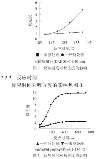 以P2O5與濃H2SO4制備三氧化硫并作為預(yù)處理劑對醋酸酐進行預(yù)處理.反應(yīng)溫度和反應(yīng)時間對黑色副產(chǎn)物的產(chǎn)生影響較大,n(醋酸酐)∶n(DAED)的影響很小.經(jīng)預(yù)處理的醋酸酐與DAED反應(yīng),當(dāng)反應(yīng)時間超過360min后,黑色副產(chǎn)物的濃度不到相同條件下未預(yù)處理時的1/5,顯示出醋酸酐預(yù)處理對黑色副產(chǎn)物的產(chǎn)生具有良好的抑制作用.