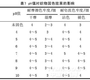 用HCl和NaOH溶液調節固色液的pH值,將織物浸漬在60℃的固色液中處理30min,浴比為40:1,考察pH值對固色效果的影響,結果如表7所示。