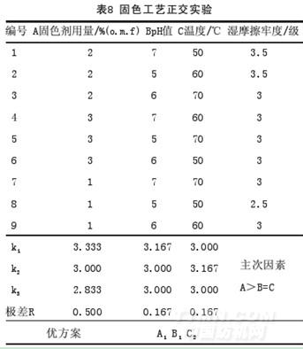 運用正交實驗的“直觀分析法”,找出該固色劑的最佳固色工藝[12]。由于各種因素對固色劑的干摩擦牢度和耐水洗牢度影響較小,且其本身牢度很好,一般都能達到4~5級,所以該固色劑的固色條件選擇以濕摩擦牢度為主要評定依據。將濕摩擦牢度為3~4級表示為3.5級,4~5級表示為4.5級。主要考察固色劑用量,固色溫度以及pH值對濕摩擦牢度的影響,其結果見表8。