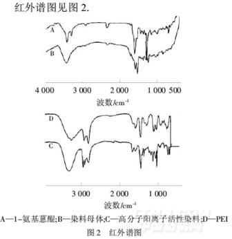 由圖2可以看出,1-氨基蒽醌的—NH2在3 423、3 303 cm-1有伸縮振動峰,蒽醌環上—C O在1 602cm-1有伸縮振動峰;染料母體的圖譜中,伯胺的2個伸縮振動峰已經消失,證明已經被均三嗪環的氯原子取代,—NH在3 400 cm-1形成寬峰,均三嗪環上—C N在1 523 cm-1處有尖利的伸縮振動峰.對比B與C圖,2 928、2 823 cm-1處是典型的—CH2對稱和非對稱伸縮振動峰,可以得出染料母體和PEI接枝成功.而高分子陽離子活性染料在1 100~1 000 cm-1附近有較強吸收峰,證明已引入了長鏈段供電結構.由C圖可以看出,2 966 cm-1處為—CH3的吸收峰證明高分子陽離子分子鏈中含有—CH3,也證明高分子染料與碘甲烷發生了反應,在965.93 cm-1處出現了C—N的彎曲振動吸收峰,表明發生了季銨化反應,生成季銨鹽.