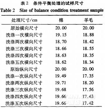 從表2的數(shù)據(jù)中可以看出,不同原料的緯平針織物經(jīng)條件平衡處理后的尺寸表現(xiàn)出不同程度的變形。羊毛的縮絨性致使羊毛的縮率明顯高于棉,織物條件平衡處理次數(shù)對織物的尺寸穩(wěn)定性有很大的影響。兩種材料經(jīng)條件平衡處理后,在第1次的洗滌松弛中織物縱、橫向尺寸變化最大,在隨后第2次、第3次的條件平衡處理中織物的尺寸變化較小,到第4次、第5次的條件平衡處理中織物的尺寸逐步趨于穩(wěn)定。