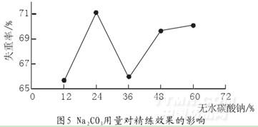 由上表可得出結論,當Na2CO3的用量為24%(omf)時,失重率最大為71.14%,可以獲得最佳的處理效果。