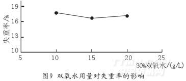 煮練后對提取出的玉米棒包皮纖維進行氧漂,其它因素不改變,僅改變30%雙氧水用量,失重率變化結果見圖9。