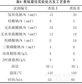 綜合上所述,煮練的最佳實驗處方及工藝條件見表8。