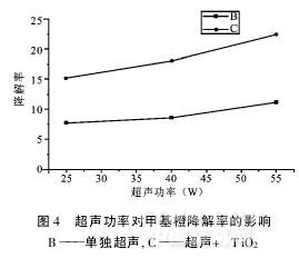 本研究按0.5g/L加入TiO2催化劑配制50mg/L,pH值為3.0的甲基橙溶液800mL,在功率為40W,頻率分別為20kHz,25kHz,33kHz和40kHz的超聲波輻射下,控制反應溫度為20℃左右,催化超聲降解60min。實驗結果如圖3。結果表明,隨著超聲波頻率的增加,甲基橙的降解效果變化平緩,選用25kHz的超聲輻射效果略好于其它三種,這可能是由于隨著頻率升高,聲空化過程變得難以發生。因為頻率增高,聲波膨脹相的時間相應變短,空化核來不及增長到可產生效應的空化泡,或者即便空化泡可以形成,但由于壓縮相時間亦短,空化泡可能來不及收縮至發生崩潰。但是由于超聲催化TiO2降解有機物的機理還不清楚,因此,超聲波頻率與TiO2催化性能的關系還難于解釋。[8-9]