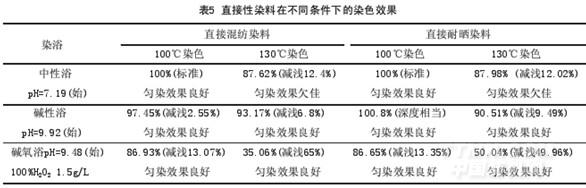 (1)直接(混紡、耐曬)染料在中性浴中,高溫(130℃)染色與沸溫(100℃)染色相比,勻染效果欠佳,而且得色深度普遍下降,下降幅度平均為12%左右。