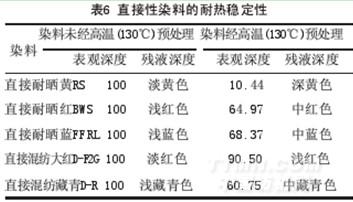 從表6可見,無論是直接耐曬染料還是直接混紡染料,經高溫(130℃)預處理再按常規沸溫(100℃)染色,染料的上染率都會顯著甚至嚴重下降。其中,直接耐曬黃RS是最典型的代表。注:①染色殘液中的染料,即沒有明顯的聚集現象,也沒有明顯的消色現象,但在常規條件下難以上染。②染液在堿性(pH=10.27)或酸性(pH=4.43)條件下,經高溫(130℃)預處理再沸溫(100℃)染色,其染色結果與中性條件下的現象相類似。