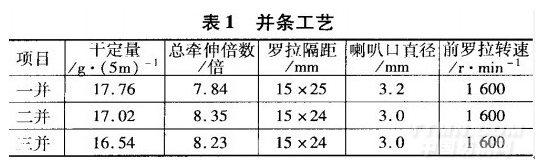 該工序采取“重加壓,大隔距,大牽伸”的工藝原則,適當(dāng)降低車速,防止絹絲、色棉纏繞羅拉膠輥,加壓量應(yīng)適當(dāng)增加,以保證足夠的握持力。適當(dāng)加大羅拉隔距,相對(duì)濕度掌握在65%左右,以減少靜電對(duì)生產(chǎn)的不良影響。注意紗條通道光潔,喇叭F3直徑大小適中,適當(dāng)加大圈條張力,避免條子掛花、堵塞。由于棉條Il}|含有20%的絹絲纖維,因此在紡紗中靜電現(xiàn)象較大,采用經(jīng)復(fù)合涂料處理的中硬度膠輥,能夠有效地減少纏繞歲拉膠輥現(xiàn)象發(fā)生。并條工序工藝配置如表1。頭道為2根色棉條、6根棉絹絲混條并合,二道和三道均為8根并合。
