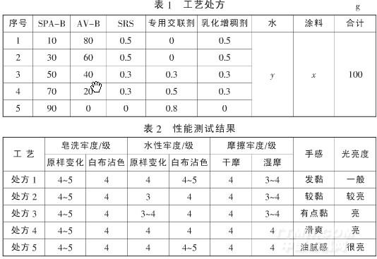 由表2可以看出,處方1處理的織物牢度雖然可以達到要求,但手感特別黏,印花部分重疊黏在一起很難撕開,成本最低(主要以SPA-B為主,其用量越少,成本越低)。而處方5處理的織物雖然牢度最好,亮度也是最好,手感稍硬不夠干爽,有油膩膩的感覺,但成本最高。處方2處理的織物手感較硬、發黏,水洗原樣變化差,成本較低。處方3處理的織物的牢度都基本可以達到要求,手感較柔軟,光亮度也很好,但還是有些發黏,成本較低。處方4處理織物的手感最好,柔軟、滑爽,光亮度也很好,牢度基本達到要求。因此,確定采用處方4工藝。