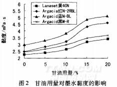 圖2中,墨水黏度隨甘油用量增加而增加。甘油用量在l0%以下時,黏度變化不大;當用量超過l0%,黏度增加幅度變大??梢?,甘油是很好的墨水黏度調節劑。
