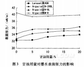 LaI1aset黃4GN,A昭acid紅N_2RBL和Argacid藍N—BL的表面張力,隨甘油用量增加而稍有提高。這可能是由于甘油的親水性極強,分布于墨水表面時,使其表面能提高的緣故。而對有較高表面張力的Argacid黑M.R墨水,加入甘油后,其表面張力則稍有降低??梢?,甘油對墨水的表面張力改變不大。
