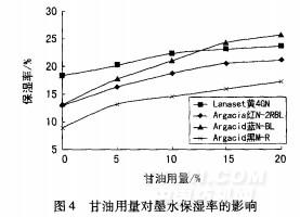 由于所使用的助溶劑A有一定的保濕性能,所以未加甘油時,墨水的保濕率可達9%~18%。隨甘油用量增加,墨水的保濕率進一步提高,這是由于甘油的一個分子具有三個羥基,能與水形成氫鍵結合,有效鎖住水分。