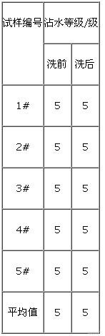 在日常檢測中,對織物的拒水級別測試,一般用淋水性能測試方法。按照GB/T4745—1997《紡織織物表面抗?jié)裥詼y定沾水壓試驗》中要求的取樣、操作程序、評定進行,織物的經(jīng)向與水流方向平行,分別測試洗前、洗后試樣的拒水級別,結(jié)果見表2。