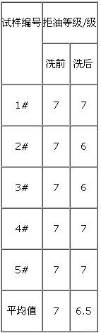 拒油等級測試采用GB/T19977—2005《紡織品 拒油性 抗碳氫化合物試驗》標(biāo)準(zhǔn)中方法。首先是用最低編號的實驗液體,以0.05 mL液體小心滴于織物上,如果在30 s內(nèi)無滲透和潤濕現(xiàn)象發(fā)生,則緊接著用較高編號的實驗液體滴于織物上。實驗連續(xù)進行,直至實驗液體在30 s內(nèi)潤濕液滴下方和周圍的織物為止??椢锏木苡偷燃壱?0 s內(nèi)不能潤濕織物的最高編號的實驗液體表示。