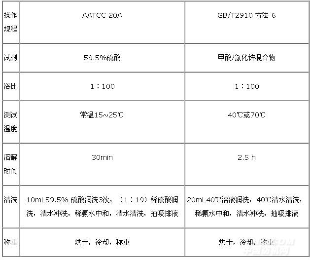 兩個標準要求的測試操作程序不同,其中最有代表性的是粘膠纖維與棉的化學分析法(見表 3)。