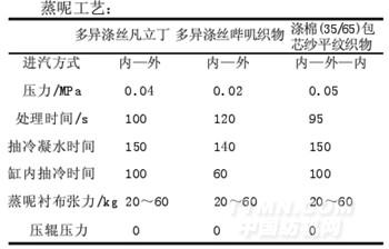 毛織物在經(jīng)過一定張力、高溫?zé)岫ㄐ翁幚砗螅瑑?nèi)部會殘留內(nèi)應(yīng)力,如果將此織物制成服裝,容易引起變形,從而影響織物的一些特性。因此在整理的最后階段必須經(jīng)過蒸呢處理,通過蒸呢,在濕熱和松弛條件下,纖維、紗線及織物的殘余內(nèi)應(yīng)力得以消除,這樣的織物不但平整挺括而且還可以改善織物的彈性、極光等[1-3]。以前,蒸呢主要應(yīng)用于純毛織物或毛滌混紡織物等,對于其它纖維的蒸呢研究較少,本文就是根據(jù)羊毛、化學(xué)纖維等在濕熱條件下經(jīng)過適當(dāng)處理,可獲得增進(jìn)定形效果的原理,對多異滌絲嗶嘰織物、多異滌絲凡立丁和滌棉包芯紗平紋織物在不同的工藝下用罐蒸機(jī)進(jìn)行蒸呢處理,研究罐蒸對上述織物的影響。