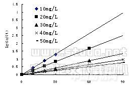 圖3是pH為5.35,活性艷紅X-3B初始濃度不同時,相對于活性艷紅X-3B的反應級數的確定。由圖3可以看出,活性艷紅X-3B濃度lg(C0/Ct)(其中C0是活性艷紅X-3B起始濃度,Ct是經過t時間處理后活性艷紅X-3B的濃度)與反應時間的關系為一條直線。表明在偏酸性條件下,活性艷紅X-3B的臭氧化反應屬于一級反應[5]。