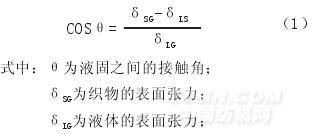 式中:r系毛細管r。降低δLS即能提高毛細管上升的液柱靜壓。因此,對紡織品只要能使之發生良好的潤濕,就能自動發生良好的滲透作用。由此可見,作為良好的潤濕和滲透作用的表面活性劑,應當使δLG及δLS明顯下降。